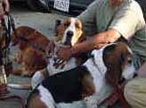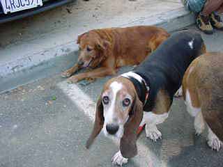 たくさんの犬達の中でもひときわ異彩を放つ、巨大バセットハウンド(ゴールデンレトリバーより大きい!)のベスとアンナの2頭、そしてゴールデンのパムの3頭!